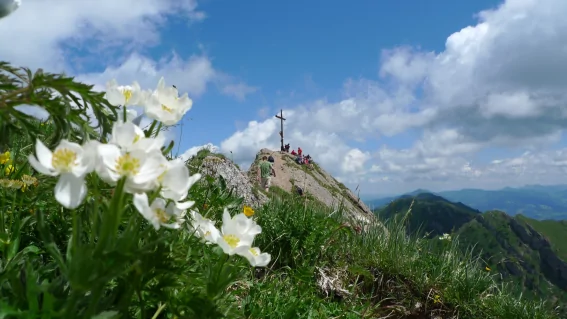 Heute steht die Gratwanderung auf dem Programm: wir steigen auf zum Sedererstuiben, 1737 m, und überschreiten nun zunächst den Buralpkopf, 1772 m, und anschließend den Gündleskopf, 1748 m. Weiter hinunter zur Gündlesscharte, 1500 m, und wieder ansteigend zum Rindalphorn, 1821 m. Hinunter zur Brunnenauscharte, 1626 m, und hinauf zum Hochgrat, 1834 m. Ein letzter kurzer Abstieg führt zum gemütlichen Staufner Haus, 1614 m.