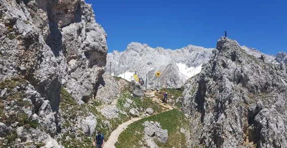Treffpunkt ist an der Talstation der Ehrwalder Almbahn. Von dort wandern wir zunächst über blühende Almwiesen und durch schattige Wälder, bevor wir in steileres Gelände gelangen, das mit kurzen Drahtseilen gesichert ist. Oben angekommen genießen wir eindrucksvolle Ausblicke auf die Zugspitze. Weiter geht es zum malerischen Seebensee und schließlich zum idyllischen Drachensee, an dem die Coburger Hütte liegt – unser Etappenziel.